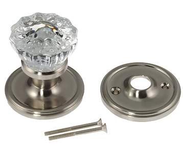 Futed Depression Crystal & Brushed Nickel Premium Passage Door Knob Set. A very special purchase of the Finest Crystal Glass Passage Door set, with all the hardware needed to install on interior or exterior passage doors.All parts are Premium Grade. Review